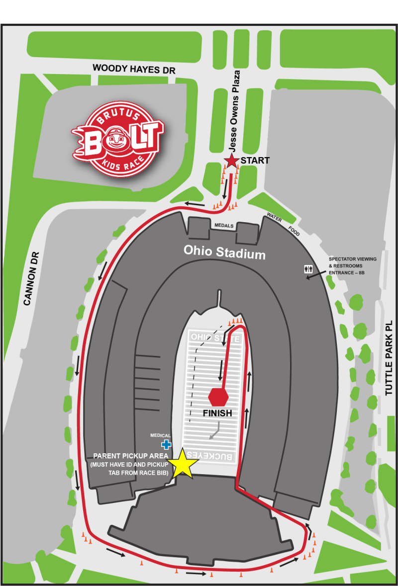 The Brutus Bolt Kids Race will start at 11:30 a.m. outside of Ohio Stadium and “Finish On The 50" inside the stadium. All registered participants receive an Official Finisher’s Medal and special Brutus Bolt Kids Race T-Shirt. See course map below for new Start Line location and course route.