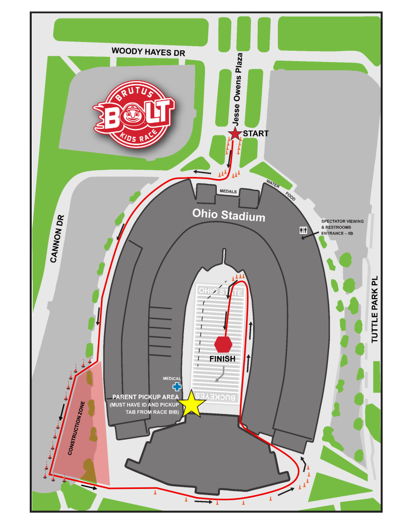 The Brutus Bolt Kids Race will start at 11:30 a.m. outside of Ohio Stadium and “Finish On The 50" inside the stadium. All registered participants receive an Official Finisher’s Medal and special Brutus Bolt Kids Race T-Shirt. See course map below for new Start Line location and course route.